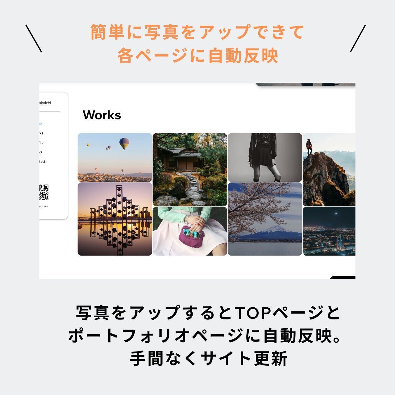 ★撮った写真を直ぐに反映!写真をアップロードすれば、自動でTOPページや Worksページに反映されます。